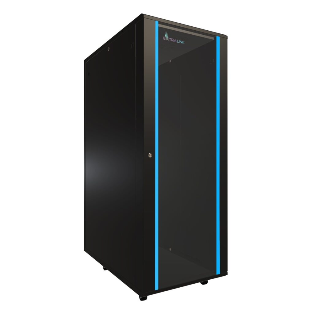 The Extralink rack cabinet is designed for offices, network server rooms and CCTV control rooms. The external walls are made of cold-rolled steel sheet, while the front door has a tempered glass pane with the possibility of opening to the left or right side.