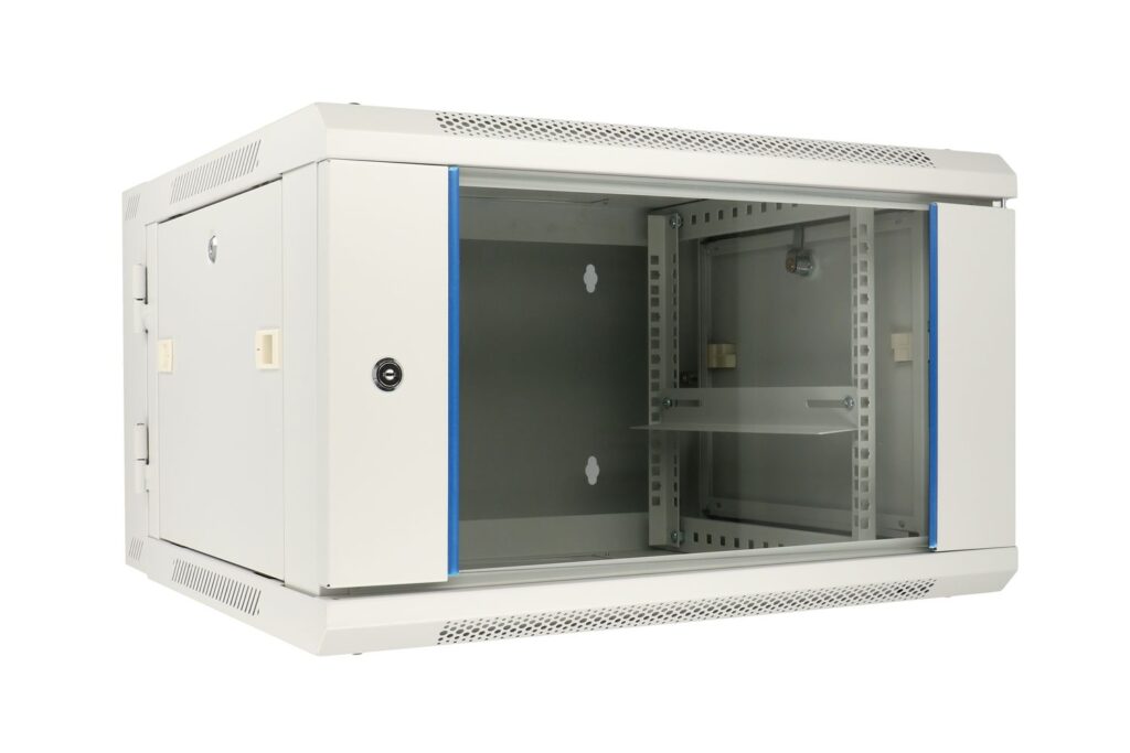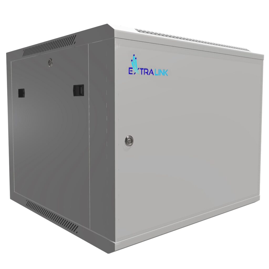 The Extralink rack cabinet is designed for wall mounting in offices, network server rooms and CCTV control rooms. The external walls are made of cold-rolled steel sheet, while the front door has a tempered glass pane with the possibility of opening to the left or right side.