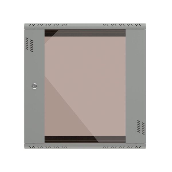 The cabinet is designed for wall mounting, with holes for easy hanging and tightening of the frame. It is available in black or gray, different heights: 4U, 6U, 9U or 12U, and depths of 450 or 600 mm. The maximum load the cabinet can support is 70 kg, making it suitable for storing various types of network and server equipment.