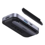 The adapter is distinguished by its compact size and slim shape. It is made of durable aluminum alloy, which is responsible for optimal heat dissipation from the interior. Moreover, the aluminum finish is pleasant to the touch and gives it a modern touch. In addition, the hub is equipped with a practical handle, so you can conveniently attach it, for example, to the screen of a tablet.