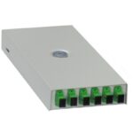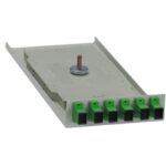 Mantar fiber optic switch PSN 1 SC 6x Simplex, designed for mounting a fiber optic cassette for 6 and 12 welds, made of 1 mm thick black sheet metal, light grey colour. It has 6 holes for SC Simplex type fiber optic connectors. Additional equipment: weld trays and adapters.