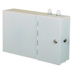 Mantar, fiber optic cabinet SRS-28/45/12 designed for wall mounting, made of 1 mm thick sheet metal, light grey colour. It constitutes a mechanical shield for passive elements of optical fibre networks. It has 22 standard holes for SC Duplex fiber optic adapters, holders for fixing a central fiber optic reinforcement element and cable organizer.