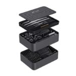 The bottom of the set has space for a total of 48 bits in 4mm size and 20 bits in 6.35mm size. To be able to pull out each bit more easily, just press the button that will cause the bits to rise up vertically. Underneath them is a container for screws and bolts as well as a magnetizer and demagnetizer for each piece.