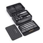 Thanks to the compact structure, the housing of the set has been divided into 3 modules, which after folding create an easy to carry and store whole. You can easily transport such a set in your car, it will fit in your backpack or in a bigger toolbox. The casing is made of durable ABS material and covered with metallic paint for better aesthetics.