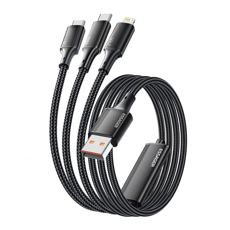 USB-A 3-in-1 Cable, Essager, EXCMTL-JJ01-P, USB-C/Lightning/Micro, 100W, 1.2m (black)